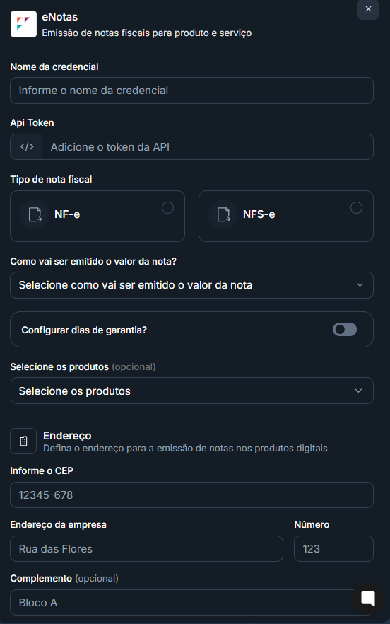API KEY: insira a chave de API, que pode ser obtida diretamente na plataforma eNotas. Caso ainda não tenha uma conta, será necessário criar uma para gerar a chave.