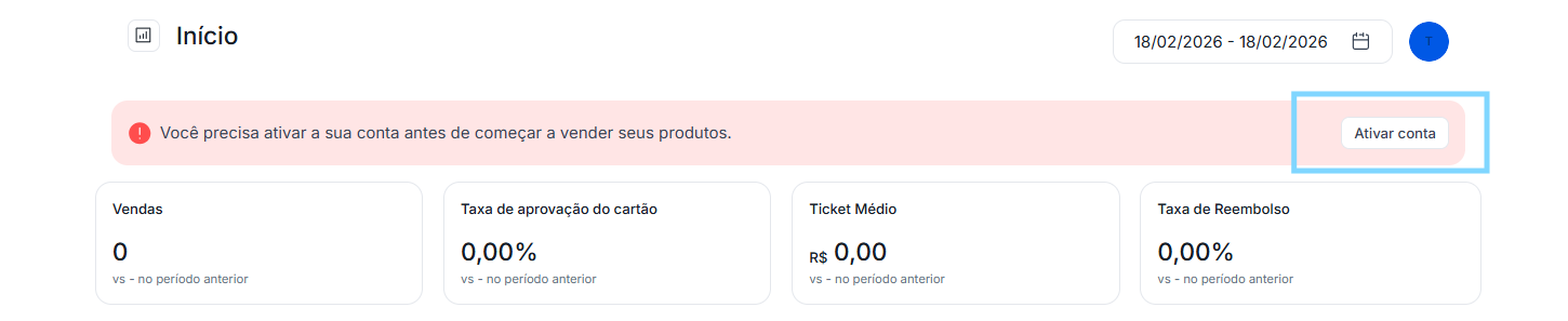 Siga as instruções indicadas para finalizar a ativação da sua conta. Essa etapa é indispensável para habilitar a cobrança de pedidos e visualizar o checkout.