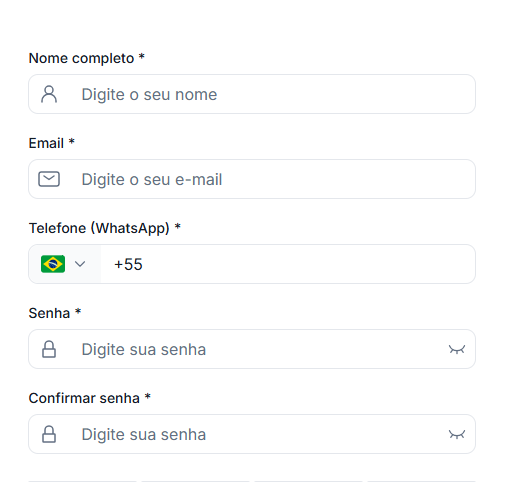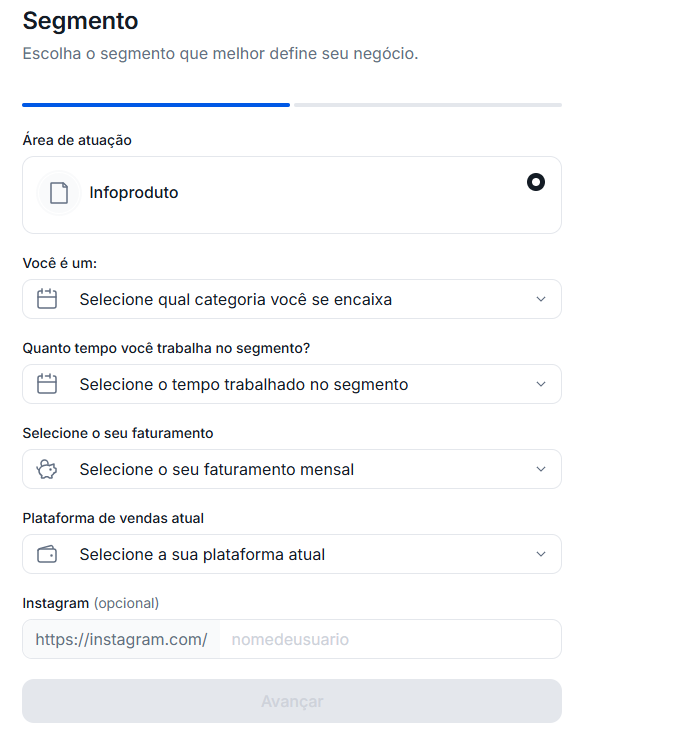 Antes de acessar o dashboard, será necessário informar alguns dados complementares sobre sua atuação.