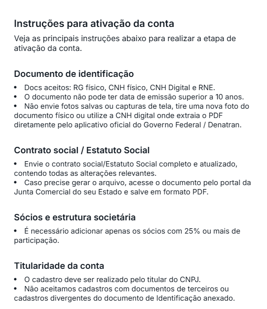 É fundamental que os documentos estejam:Essas etapas são essenciais para garantir a segurança da conta e a liberação da funcionalidade de pagamentos.